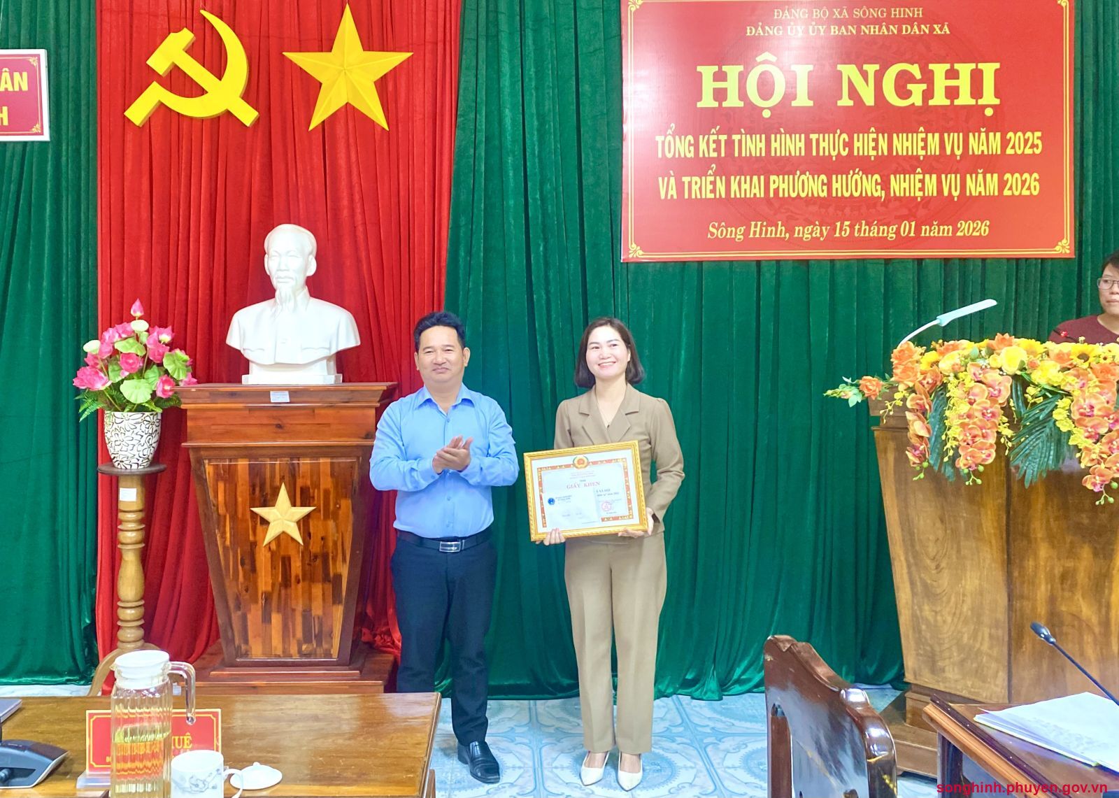 Bí thư Đảng ủy, Phó Chủ tịch UBND xã Sông Hinh trao tặng giấy khen cho đơn vị Phòng VH-XH thành tích hoàn thành xuất sắc nhiệm vụ năm 2025