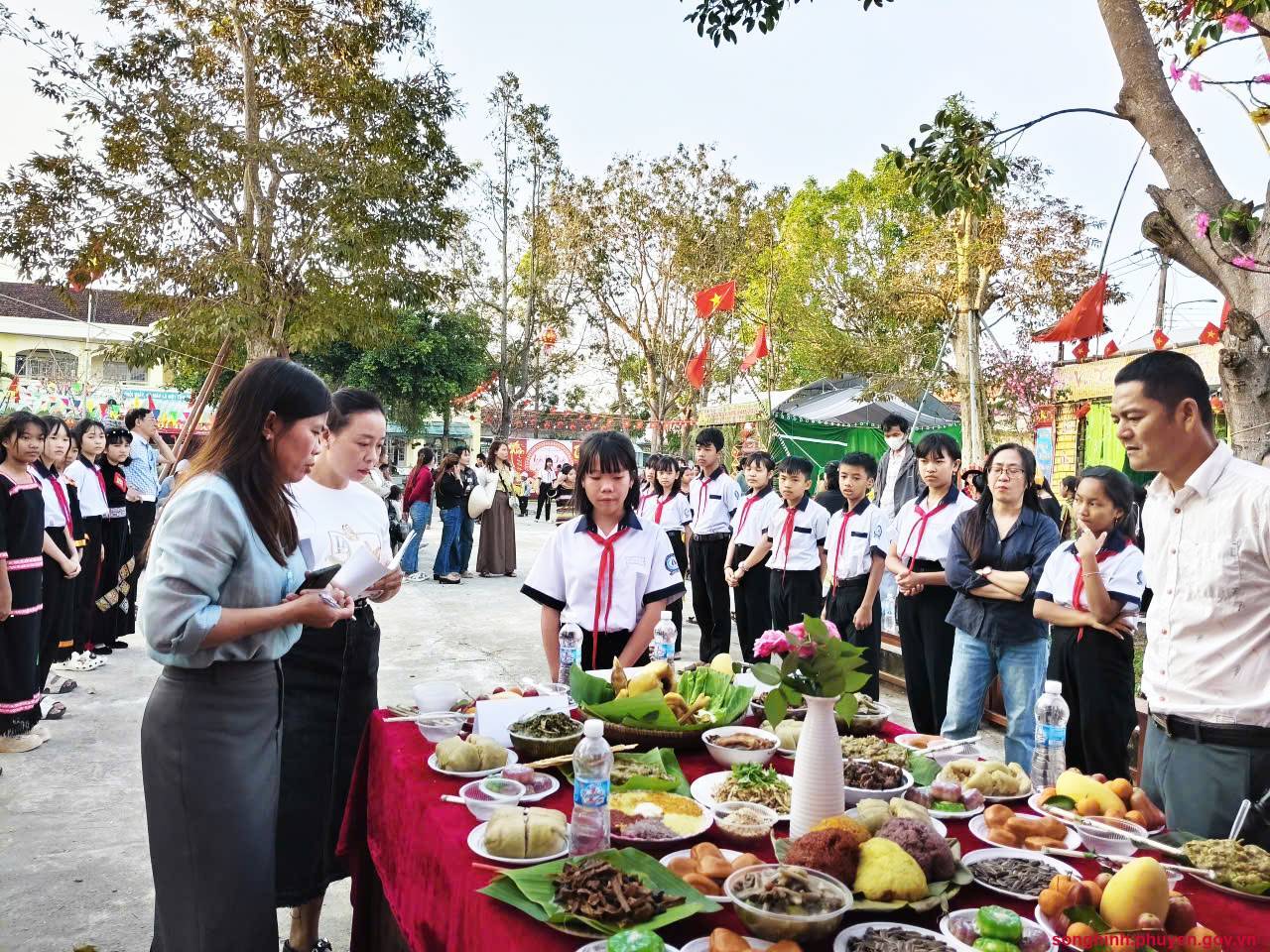 Dưới bàn tay khéo léo của các em học sinh và sự hướng dẫn của thầy cô, những mô hình nhà sàn, những gian hàng "Nông sản sạch" và "Ẩm thực quê" được tái hiện sinh động. Các sản phẩm đặc trưng địa phương như mía, chuối, dưa hấu... được bày biện hài hòa bên cạnh những bộ trang phục truyền thống của người Ê Đê, Ba Na, Tày, Nùng... tạo nên một bức tranh đa văn hóa rực rỡ giữa lòng xã Sông Hinh.
