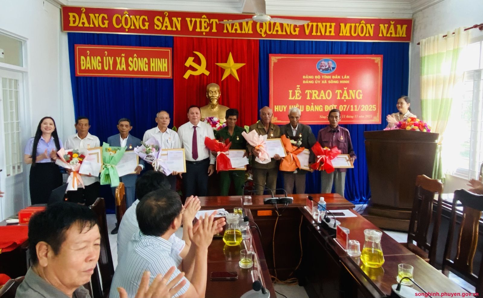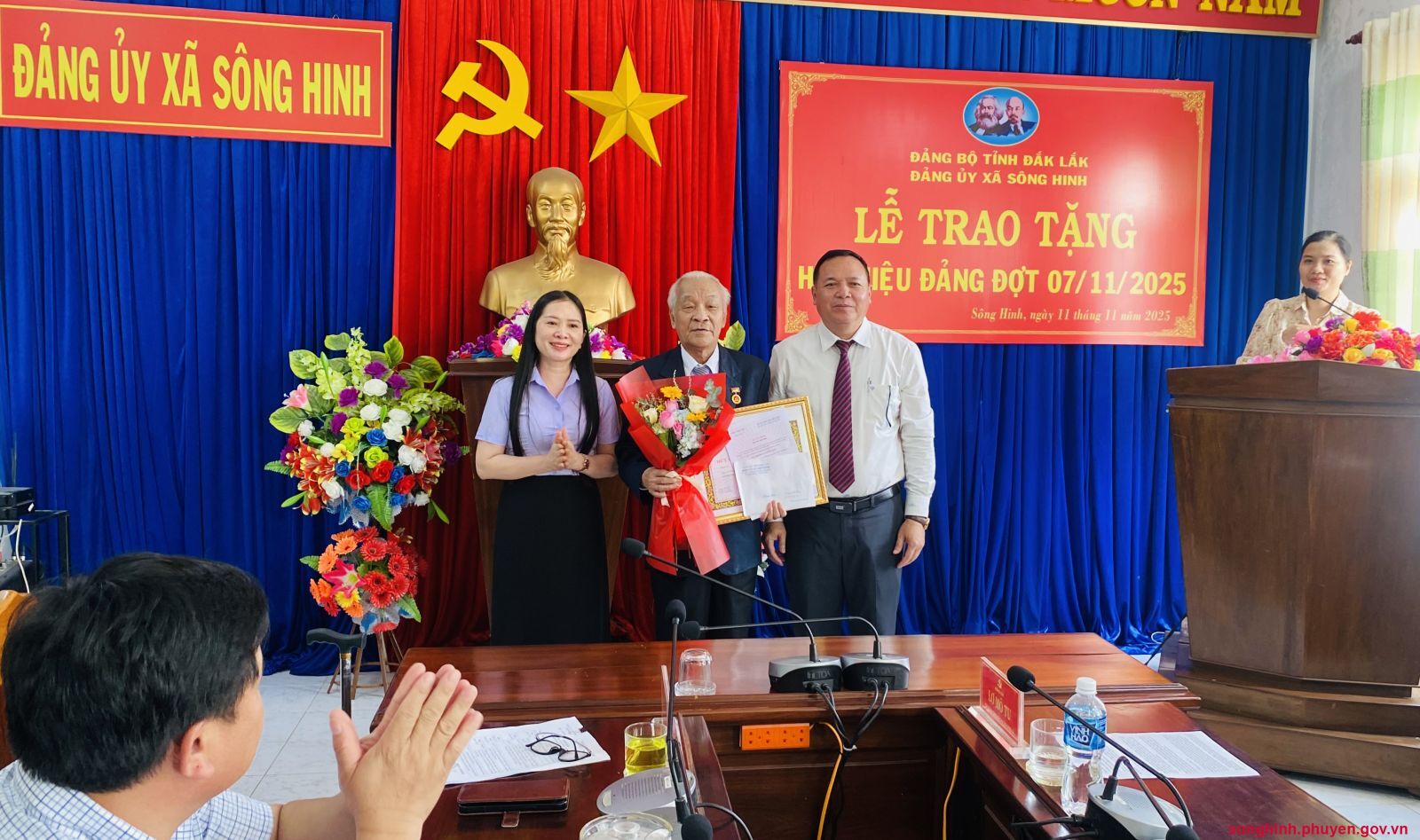 Sáng 11/11/2025, Đảng ủy xã Sông Hinh đã tổ chức trọng thể Lễ trao tặng Huy hiệu Đảng đợt ngày 07/11/2025 đối với 15 đảng viên lão thành. Buổi lễ là dịp để tri ân, ghi nhận những đóng góp to lớn của các đảng viên trong sự nghiệp cách mạng của Đảng, góp phần xây dựng quê hương Sông Hinh ngày càng phát triển.