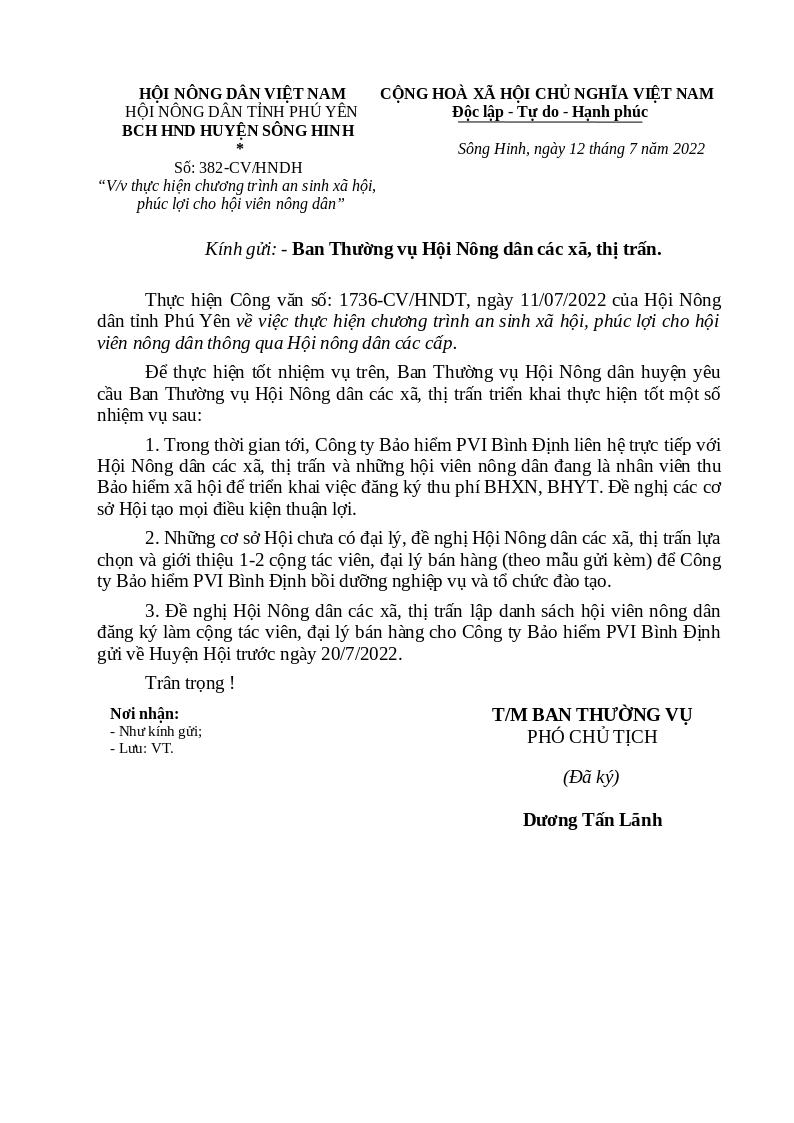 | Số hiệu | Số:382-CV/HNDH, ngày 12/7/2022 | Cơ quan ban hành | 6282100f348dc42d8c0368c4 |