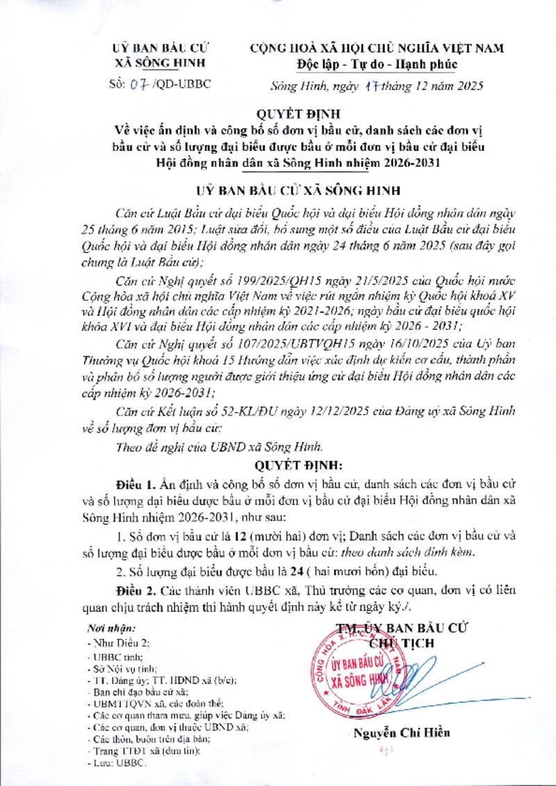 | Tiêu đề văn bản | Công bố ấn định số đơn vị bầu cử, danh các đơn vị bầu cử, số lượng đại biểu bầu ở mỗi đơn vị - HĐND xã Sông Hinh 2026-2031 | ||