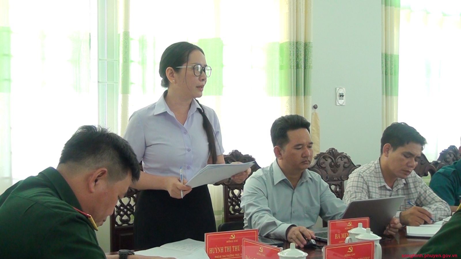 Phó Bí thư Thường trực Đảng ủy xã Sông Hinh Huỳnh Thị Thu Trang báo cáo với đoàn công tác về công tác tuyên truyền tại xã