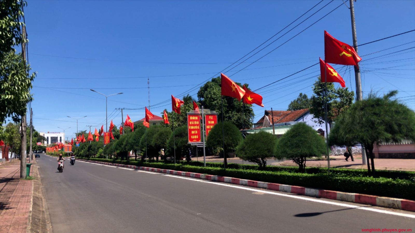 Cờ hoa chào mừng Đại hội Đảng bộ tỉnh Đắk Lắk lần thứ I tại trung tâm xã Sông Hinh