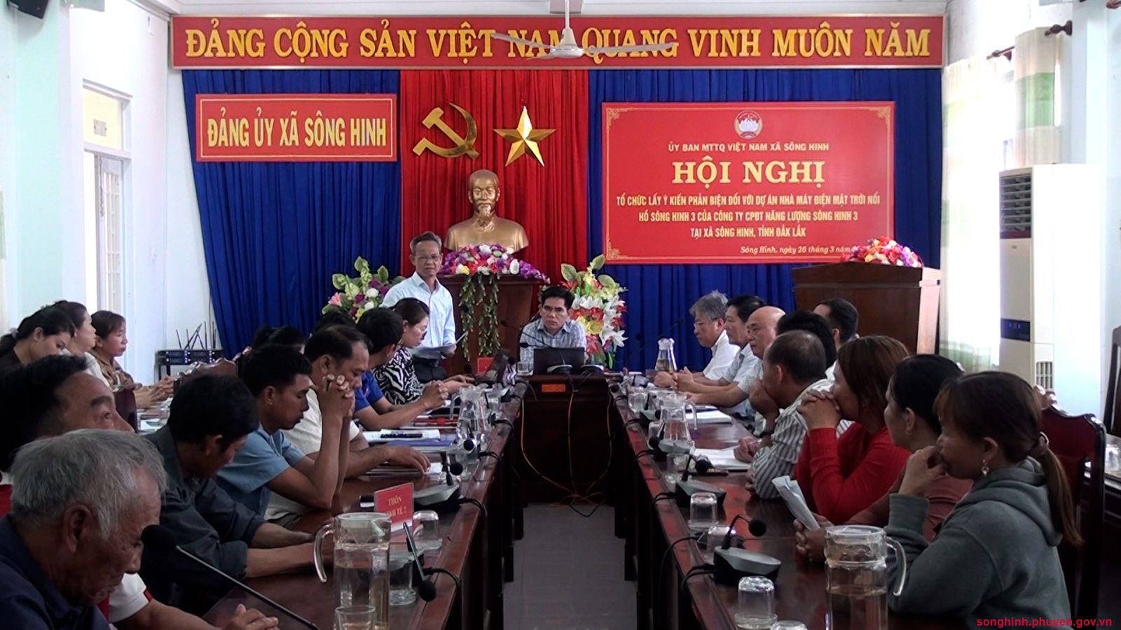 Chiều ngày 26/3/2026, tại Hội trường Đảng ủy xã Sông Hinh, Ủy ban MTTQ Việt Nam xã Sông Hinh (tỉnh Đắk Lắk) đã tổ chức Hội nghị lấy ý kiến phản biện đối với hồ sơ đề nghị chấp thuận chủ trương đầu tư dự án Nhà máy điện mặt trời nổi hồ Sông Hinh 3.