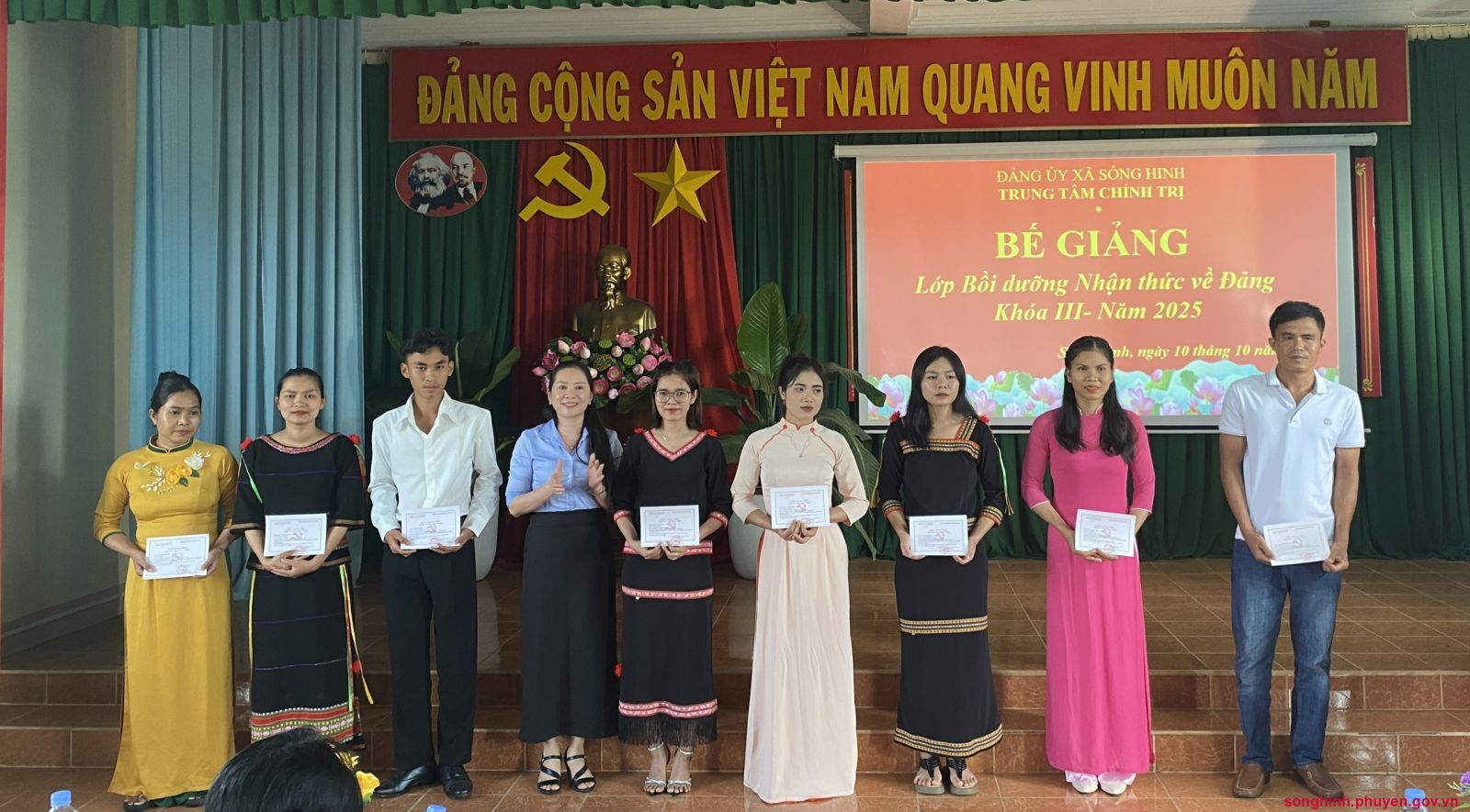Chiều ngày 10/10, Trung tâm Chính trị Sông Hinh tổ chức Lễ bế giảng lớp bồi dưỡng nhận thức về Đảng khóa III/2025. Tham dự lễ bế giảng có lãnh đạo các xã: Sông Hinh, EaLy, Đức Bình cùng 55 học viên của lớp học.