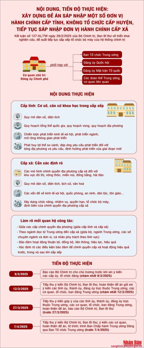 Chủ nhật, 02/03/2025 | 10:00 - 137 A- A A+ | Nội dung, tiến độ thực hiện xây dựng đề án sáp nhập một số đơn vị hành chính cấp tỉnh, không tổ chức cấp huyện... Chia sẻ Lưu Tổng số điểm của bài viết là: 0 trong 0 đánh giá Click để đánh giá bài viết